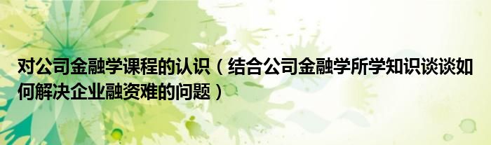 您好,今天帅帅来为大家解答以上的问题。对公司金融学课程的认识,结合公司金融学所学知识谈谈如何解决企业融资难的问题相信很多小伙伴还不知道,现在让我们一起来看看吧!