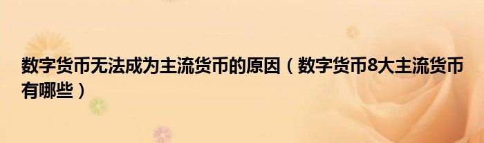 您好,今天帅帅来为大家解答以上的问题。数字货币无法成为主流货币的原因,数字货币8大主流货币有哪些相信很多小伙伴还不知道,现在让我们一起来看看吧!