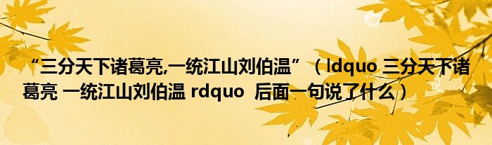 您好,今天帅帅来为大家解答以上的问题。“三分天下诸葛亮,一统江山刘伯温”,ldquo 三分天下诸葛亮 一统江山刘伯温 rdquo 后面一句说了什么相信很多小伙伴还不知道,现在让我们一起来看看吧!