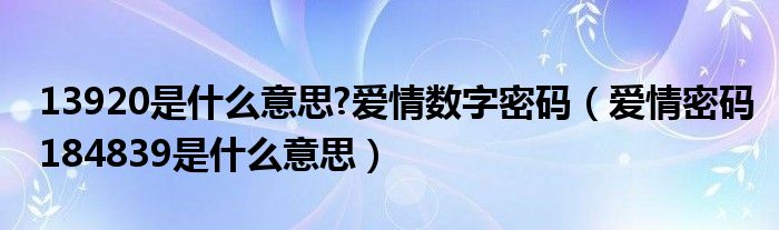 您好,今天帅帅来为大家解答以上的问题。13920是什么意思?爱情数字密码,爱情密码184839是什么意思相信很多小伙伴还不知道,现在让我们一起来看看吧!